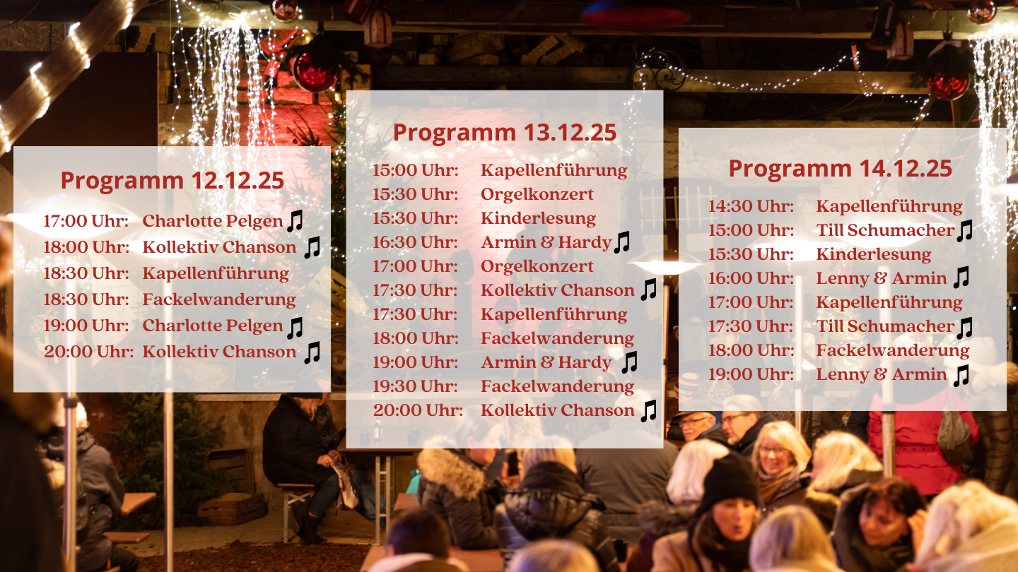 Treffpunkt für die Kapellenführungen ist vor der Schlosskapelle, für die Fackelwanderungen an der Feuertonne vor dem Schloss. Die Kinderlesungen finden in der Geschirrkammer am Schloss Café statt.